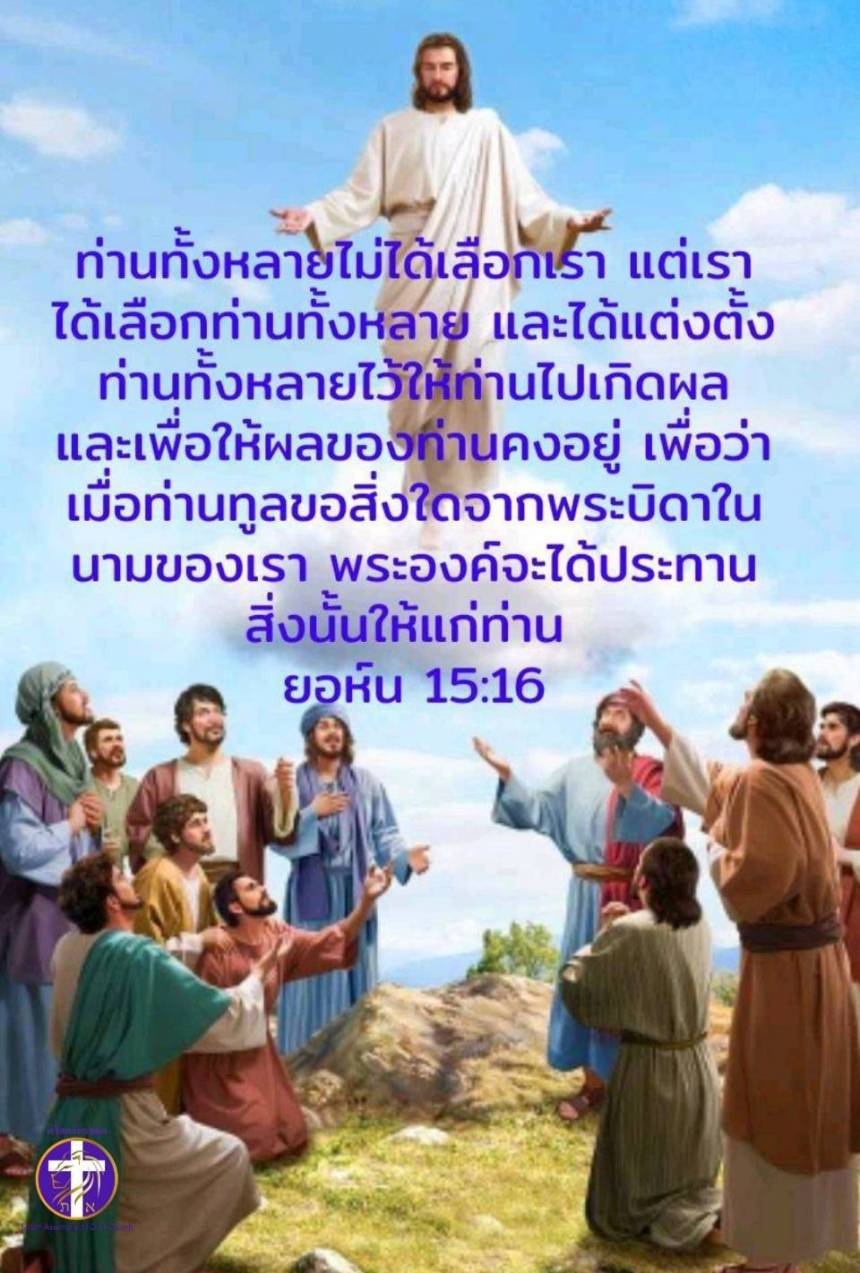 🔸️ท่านทั้งหลายไม่ได้เลือกเรา แต่เราได้เลือกท่านทั้งหลาย และได้แต่งตั้งท่านทั้งหลายไว้ให้ท่านไปเกิดผล และเพื่อให้ผลของท่านคงอยู่ เพื่อว่าเมื่อท่านทูลขอสิ่งใดจากพระบิดาในนามของเรา พระองค์จะได้ประทานสิ่งนั้นให้แก่ท่าน
