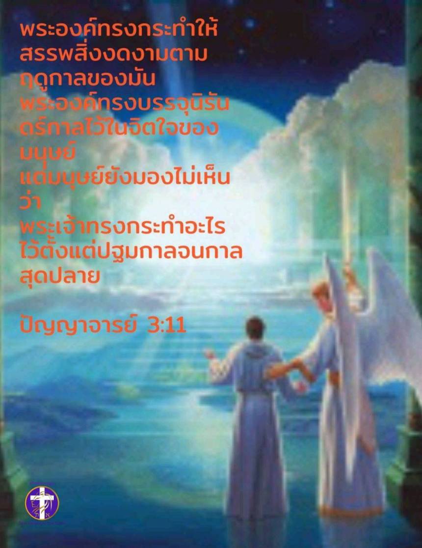 “พระองค์ทรงกระทำให้สรรพสิ่งงดงามตามฤดูกาลของมัน พระองค์ทรงบรรจุนิรันดร์กาลไว้ในจิตใจของมนุษย์ แต่มนุษย์ยังมองไม่เห็นว่า พระเจ้าทรงกระทำอะไรไว้ตั้งแต่ปฐมกาลจนกาลสุดปลาย”