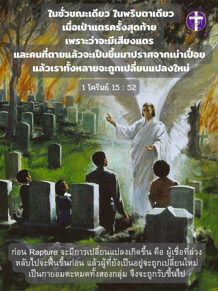 🎯 “ในชั่วขณะเดียว ในพริบตาเดียว เมื่อเป่าแตรครั้งสุดท้าย เพราะว่าจะมีเสียงแตร และคนที่ตายแล้วจะเป็นขึ้นมาปราศจากเน่าเปื่อย แล้วเราทั้งหลายจะถูกเปลี่ยนแปลงใหม่”