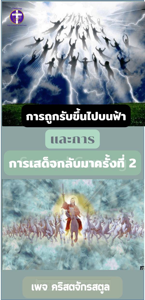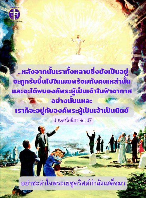 🔸️ด้วยว่าองค์พระผู้เป็นเจ้าจะเสด็จมาจากสวรรค์ด้วยพระดำรัสสั่ง ด้วยสำเนียงเรียกของเทพบดีและด้วยเสียงแตรของพระเจ้า และคนทั้งปวงในพระคริสต์ที่ตายแล้วจะเป็นขึ้นมาก่อน หลังจากนั้นเราทั้งหลายซึ่งยังเป็นอยู่ จะถูกรับขึ้นไปในเมฆพร้อมกับคนเหล่านั้น และจะได้พบองค์พระผู้เป็นเจ้าในฟ้าอากาศ อย่างนั้นแหละ เราก็จะอยู่กับองค์พระผู้เป็นเจ้าเป็นนิตย์