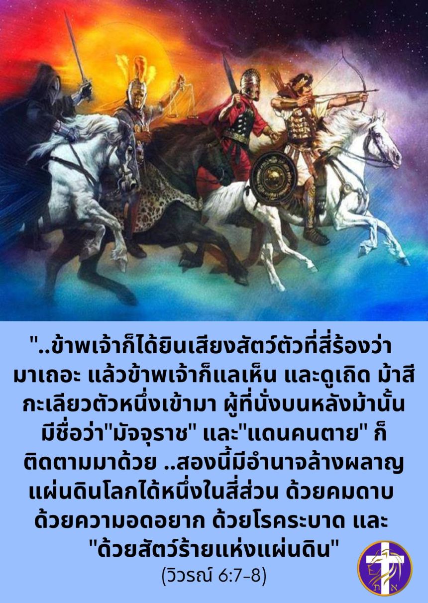 🎯 “..ข้าพเจ้าก็ได้ยินเสียงสัตว์ตัวที่สี่ร้องว่า มาเถอะ แล้วข้าพเจ้าก็แลเห็น และดูเถิด ม้าสีกะเลียวตัวหนึ่งเข้ามา ผู้ที่นั่งบนหลังม้านั้นมีชื่อว่า”มัจจุราช” และ”แดนคนตาย” ก็ติดตามมาด้วย ..สองนี้มีอำนาจล้างผลาญแผ่นดินโลกได้หนึ่งในสี่ส่วน ด้วยคมดาบ ด้วยความอดอยาก ด้วยโรคระบาด และ “ด้วยสัตว์ร้ายแห่งแผ่นดิน”