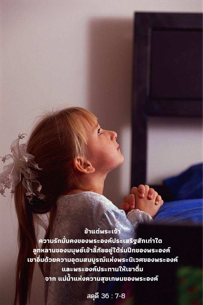 💌 พระบิดาเจ้าข้า ขอบพระคุณพระองค์ที่ทรงประทานความรักมั่นคงให้กับลูกด้วยพระทัยเมตตากรุณาของพระองค์ทุกวัน ขอโปรดให้ลูกตระหนักว่า พระองค์ทรงปกป้องคุ้มครองให้ลูกดำเนินชีวิตด้วยความปลอดภัยอยู่ทุกวัน ภายใต้ร่มปีกแห่งพระคุณของพระองค์ และในอนาคตที่จะมาถึง ขอโปรดให้ลูกซาบซึ้งกับการเลี้ยงดูของพระองค์ ที่นำความอิ่มเอิบและดับความกระหายจากแม่น้ำแห่งความสุขเกษมของพระองค์มาสู่จิตวิญญาณของลูก ผ่านคริสตจักรนี้ที่ลูกเป็นสมาชิกอยู่ ทูลอธิษฐานในพระนามขององค์พระเยซูคริสต์เจ้า อาเมน