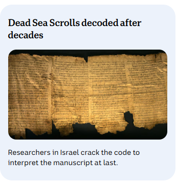 หนังสือม้วนทะเลตาย เป็นสมบัติทางศาสนาที่สำคัญที่สุดชิ้นหนึ่งที่เคยค้นพบ โดยหลายฉบับเป็นสำเนาพระคัมภีร์ที่เก่าแก่ที่สุดที่ยังหลงเหลืออยู่